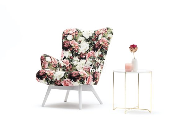 W aranżacji zaprezentowano model w welurowej tkaninie wzór PEONIE, dopełniony nóżkami w kolorze BIAŁYM.